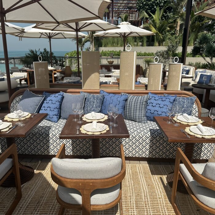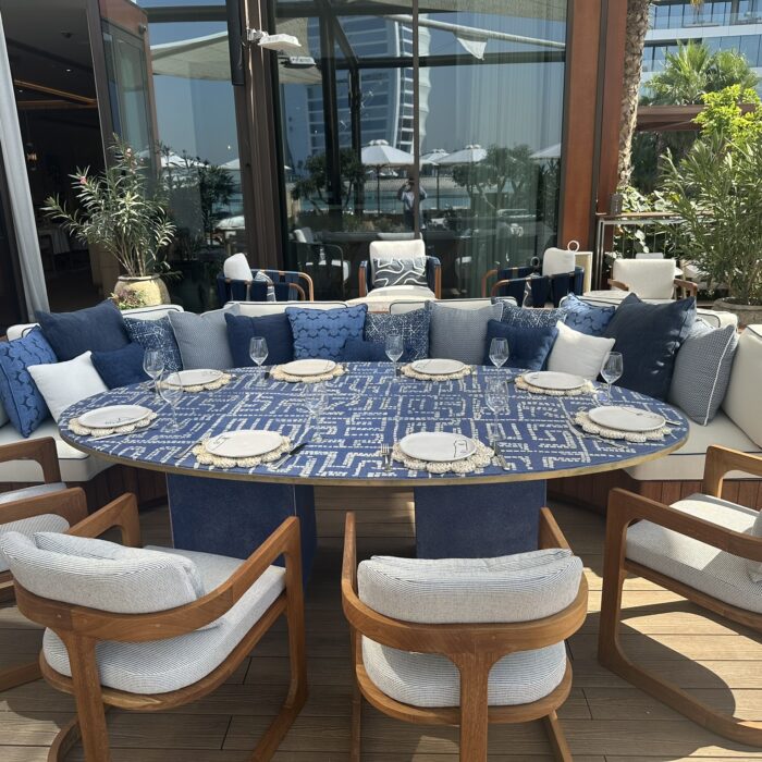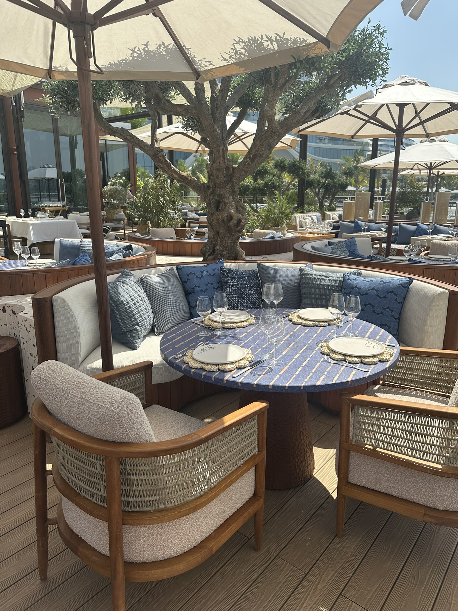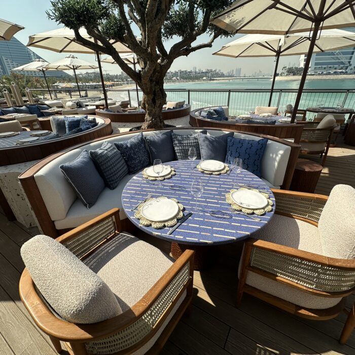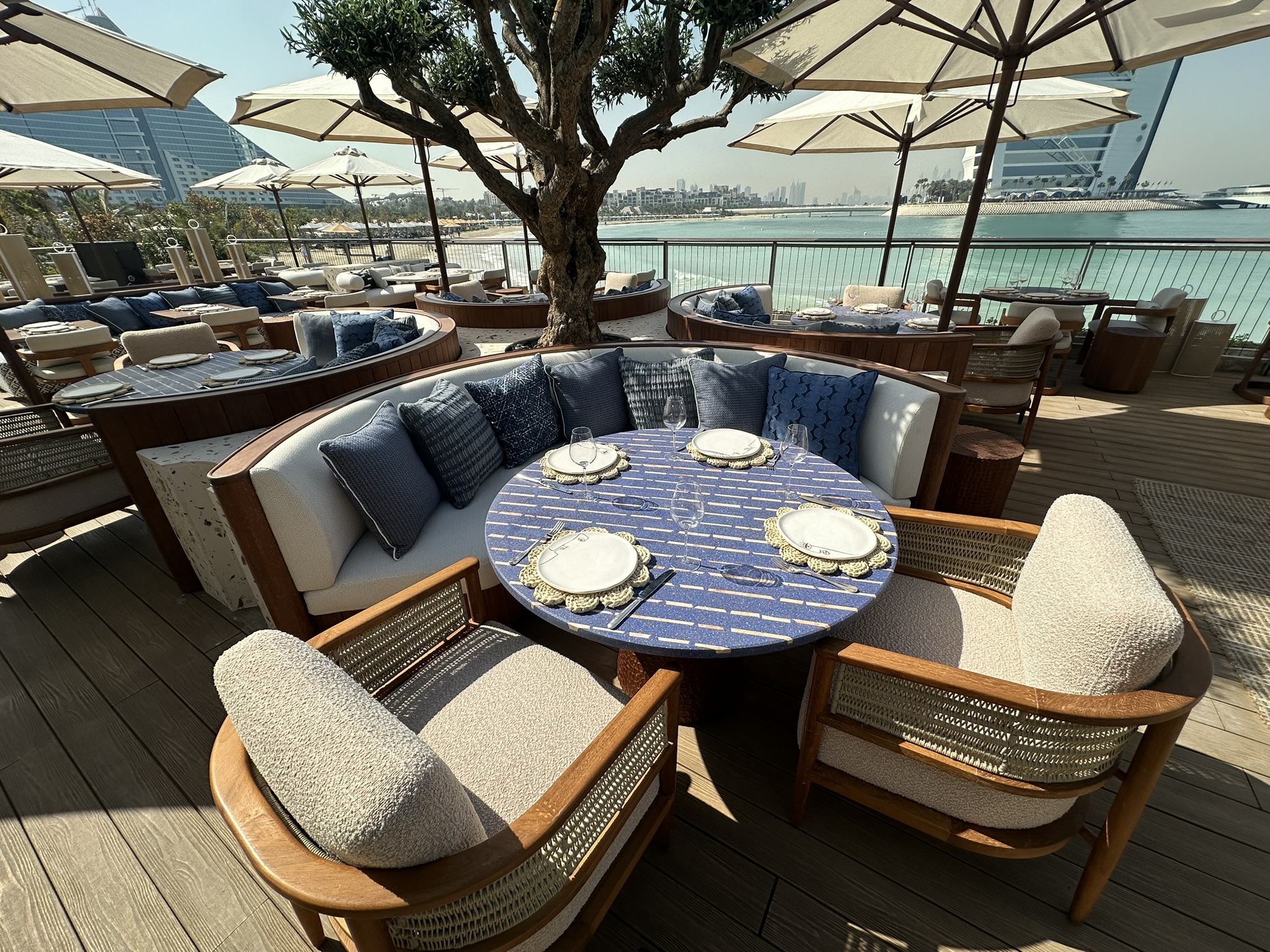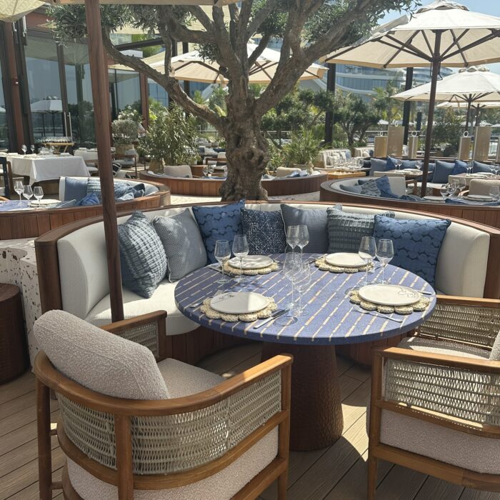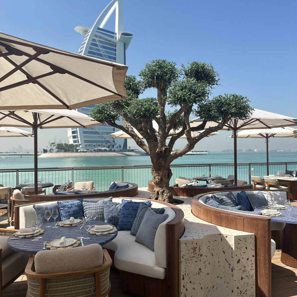 This stunning terrace, overlooking the iconic Burj Al Arab, is a sun-drenched sanctuary inspired by the effortless charm of the Greek islands. With soft coastal hues, curved seating, olive trees, and warm teak wood underfoot, the space invites you to linger and unwind. Our restaurant captures the essence of laid-back luxury and life by the ocean where every detail reflects the timeless beauty of island living. Whether you’re sipping a crisp rosé or enjoying a long, leisurely lunch, every moment on this terrace feels like an escape to the Aegean.