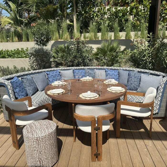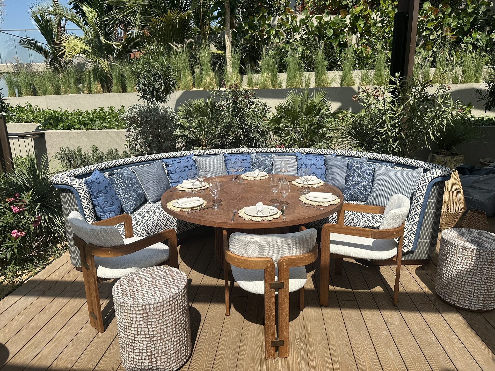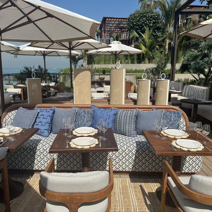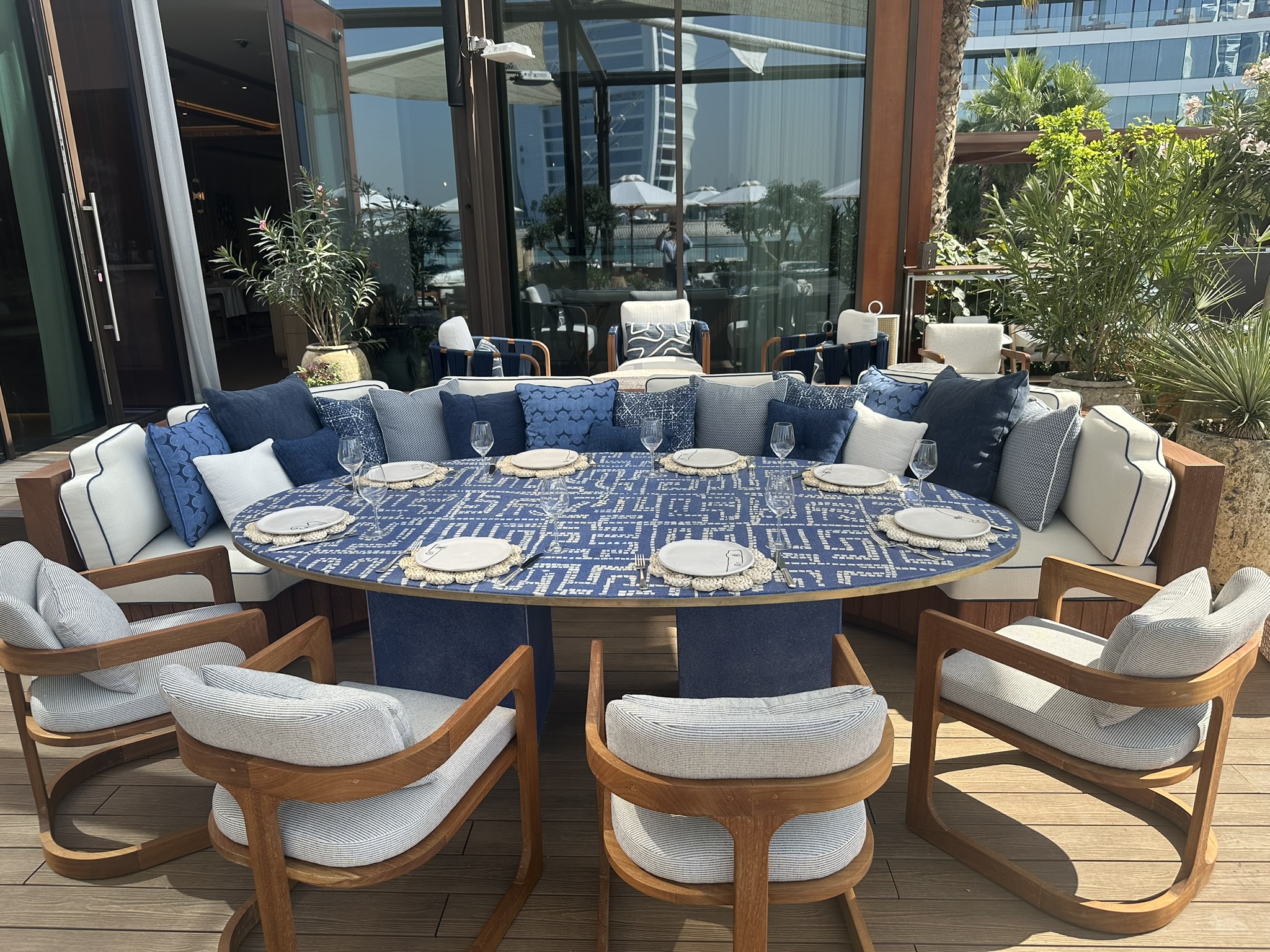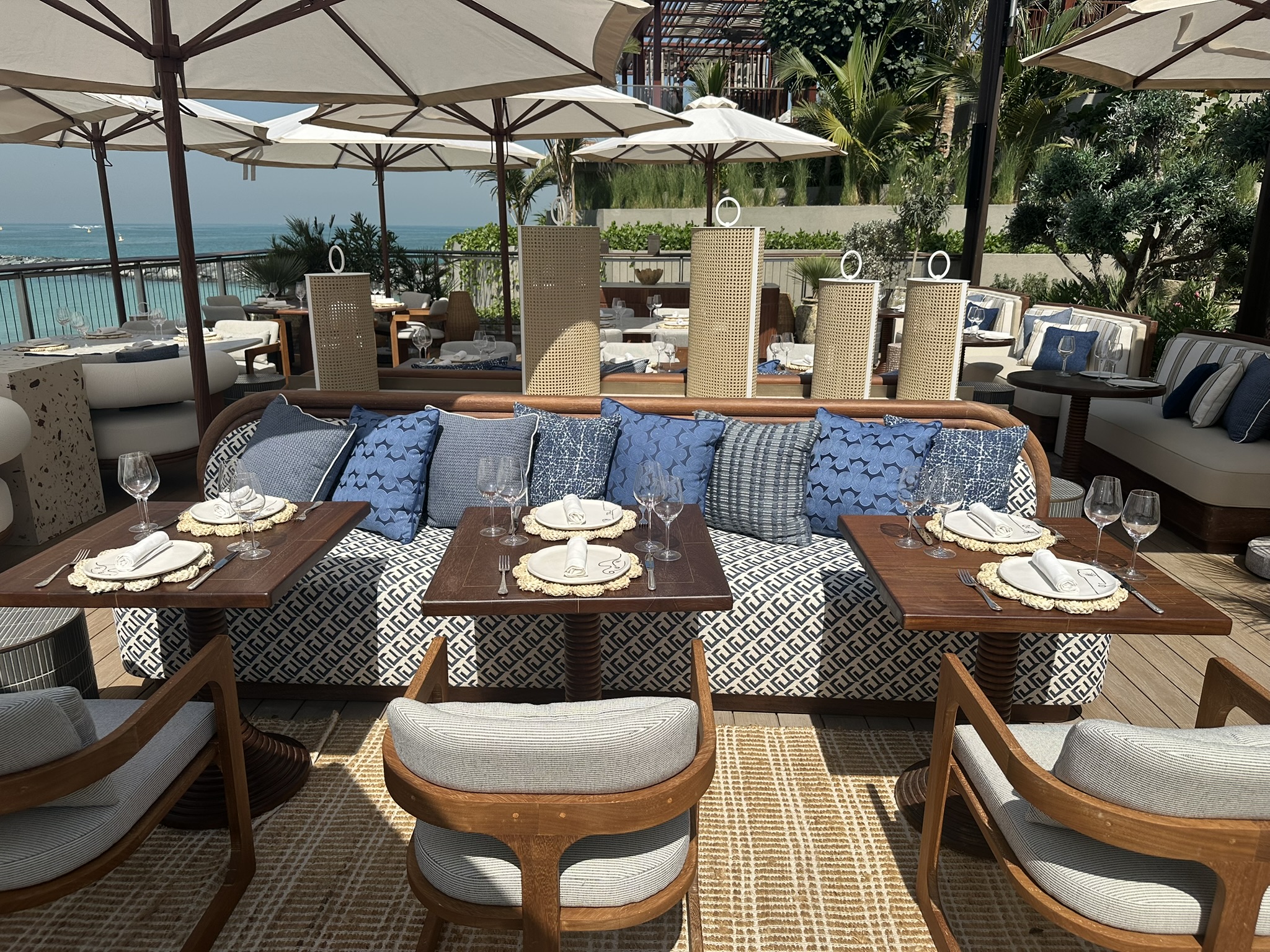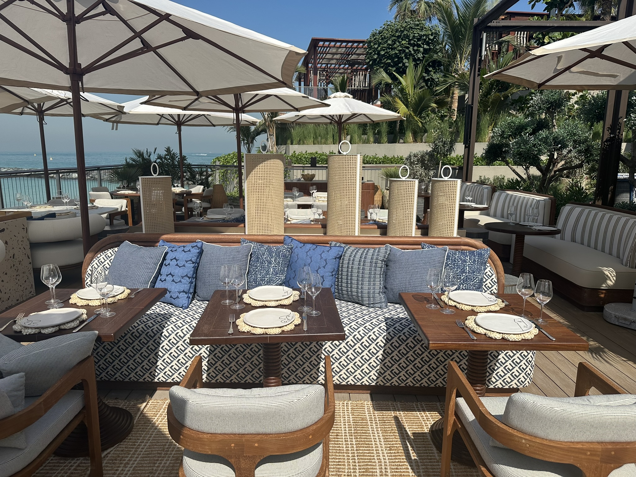 This stunning terrace, overlooking the iconic Burj Al Arab, is a sun-drenched sanctuary inspired by the effortless charm of the Greek islands. With soft coastal hues, curved seating, olive trees, and warm teak wood underfoot, the space invites you to linger and unwind. Our restaurant captures the essence of laid-back luxury and life by the ocean where every detail reflects the timeless beauty of island living. Whether you’re sipping a crisp rosé or enjoying a long, leisurely lunch, every moment on this terrace feels like an escape to the Aegean.